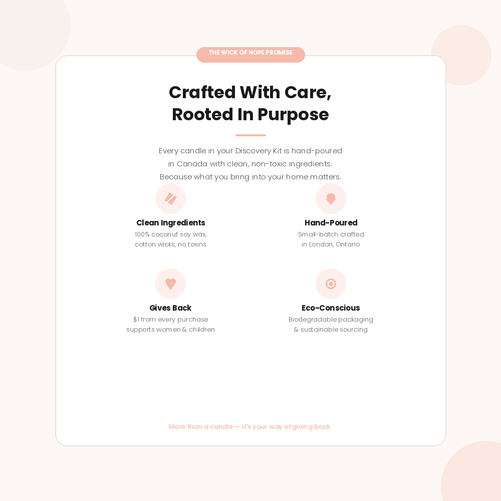 At Wick of Hope, we want you to feel confident from checkout to first light. Every candle is hand-poured, inspected, and carefully packaged in London, Ontario, so it arrives safely and ready to enjoy.